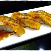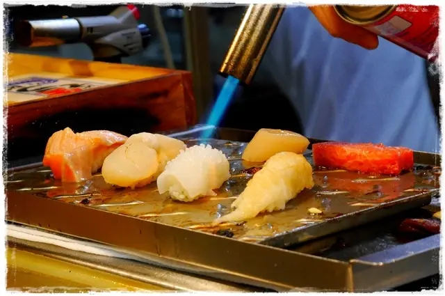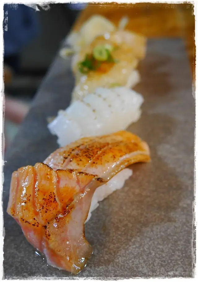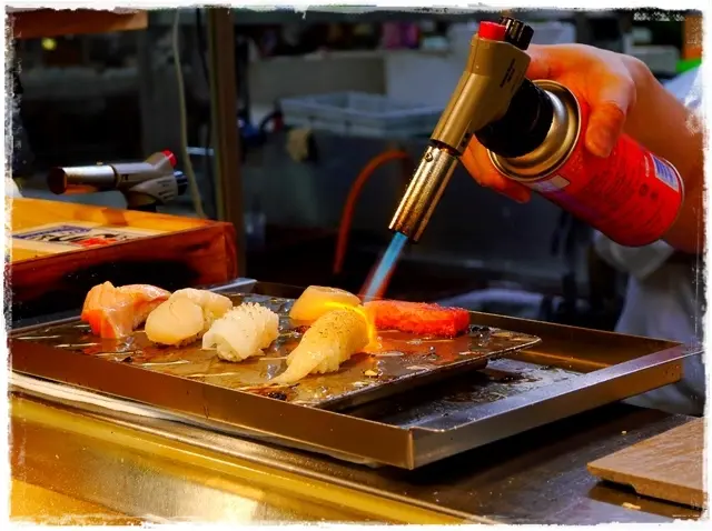 將生魚片握壽司炙燒得吱吱作響,流露出的魚油散發出迷人的香氣。