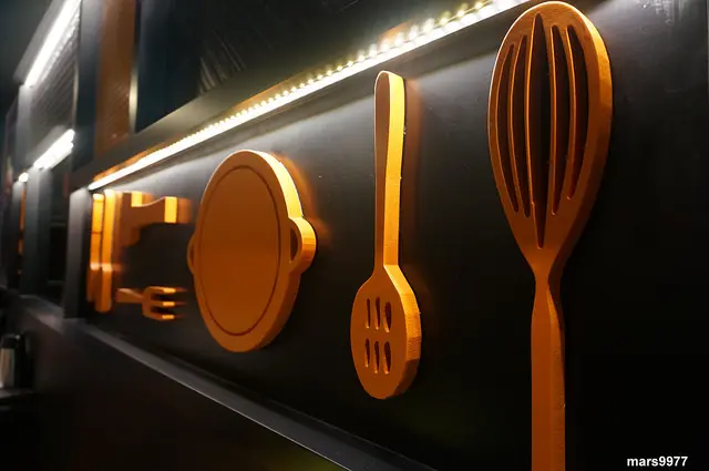 而筷箸湯匙、調味料等等的收納規劃採用鐵製的規格設計制式呈現在桌面上蠻有特色的。