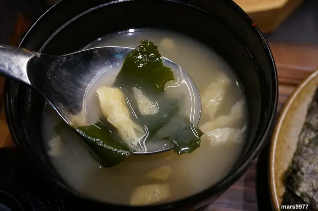 套餐組合還有附搭上了湯品跟甜點,像這個味噌湯加上了碎豆皮。
