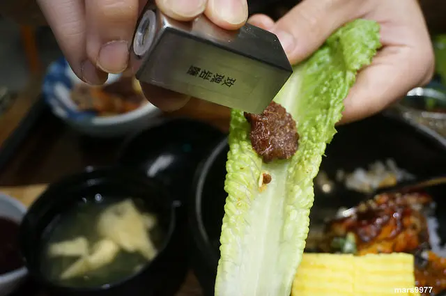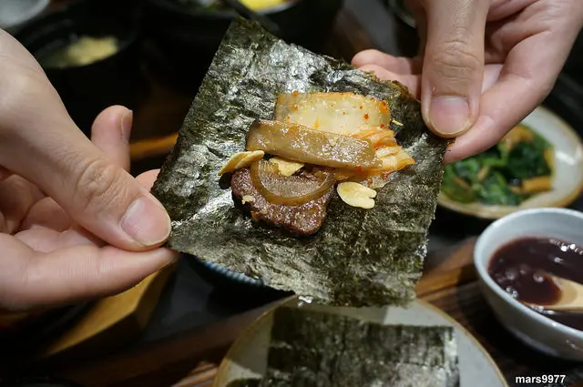 而如果是點韓味噌橫膈肉,這道趨近韓風料理就一同要拿海苔來嚐嚐。