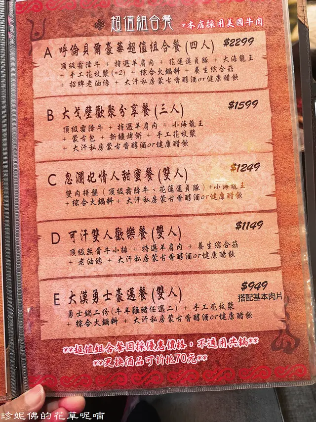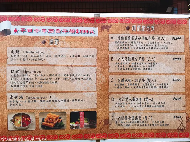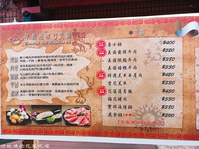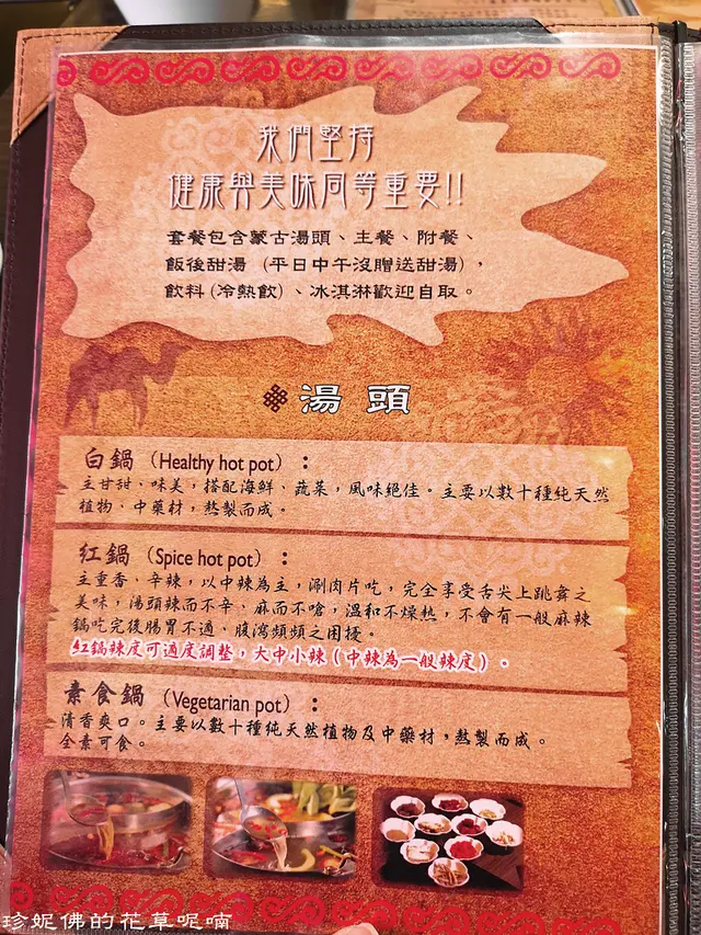 套餐有蒙古湯底、主餐(肉盤)、附餐(白飯或麵類)
