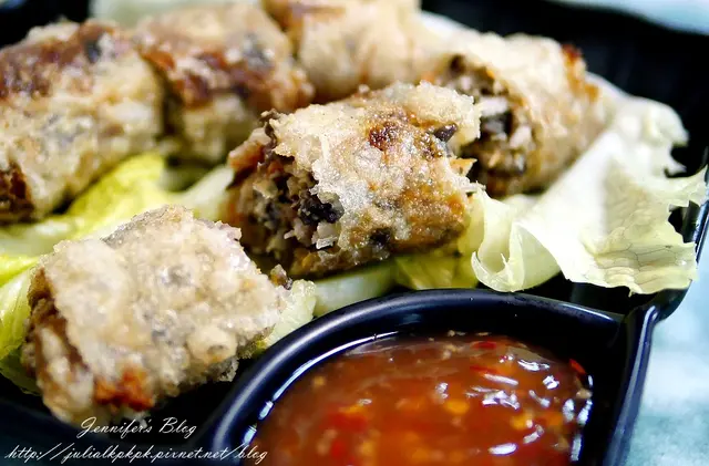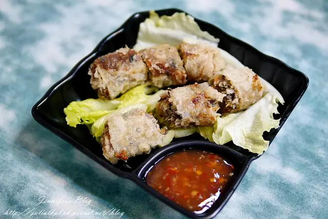 炸春捲 55元,一份兩捲,春捲裡面包的料感覺滿多樣的,下方有鋪生菜,和平常吃的台式春捲內餡完全不同,皮的口感薄而酥脆