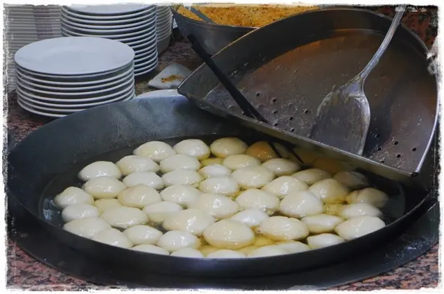 在熱油中快速滾動,像在油中游泳一般。會將熱油中的麻糬放在上層瀝乾後,才會接著被放在盤子上。