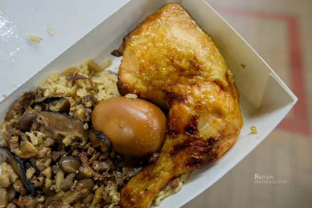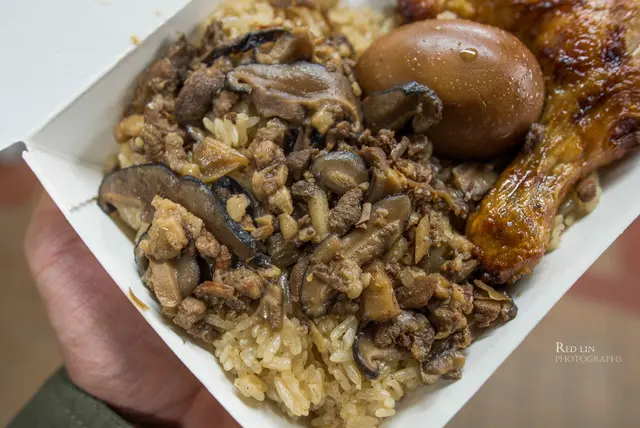 而底下是我們當下吃的組合,油飯 (半斤)+雞腿+滷蛋 (共130元)。(紅蛋基本上是彌月油飯的組合,不過想吃應該是可以購買)