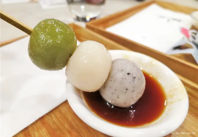 只差在白玉的口味不同,每顆白玉都QQ好吃!除了搭配紅豆泥之外,還有偏醬油級的鹹甜沾醬
