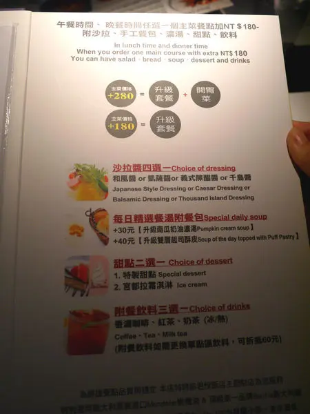 無論午晚餐,只要+$180就可升等為基本的套餐,