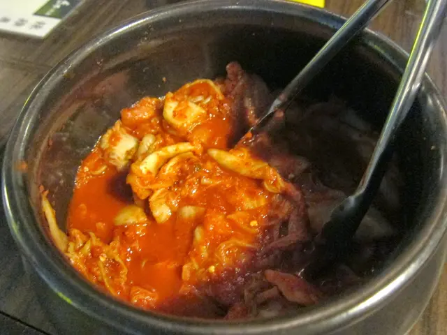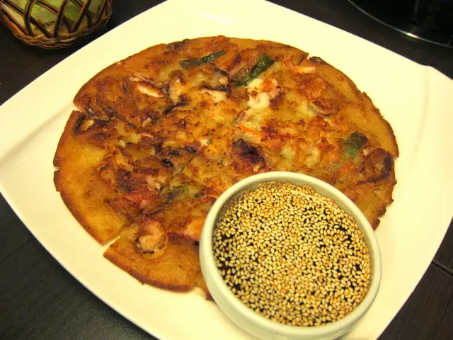 吃韓式料理必點海鮮煎餅!紅通通的海鮮煎餅偏薄,但餅裡面的料可不少喔~薄也有薄的好處,那就是餅皮很酥脆,有別於大部份店家以蛋糕切片的方式切初三角錐狀的海鮮煎餅。