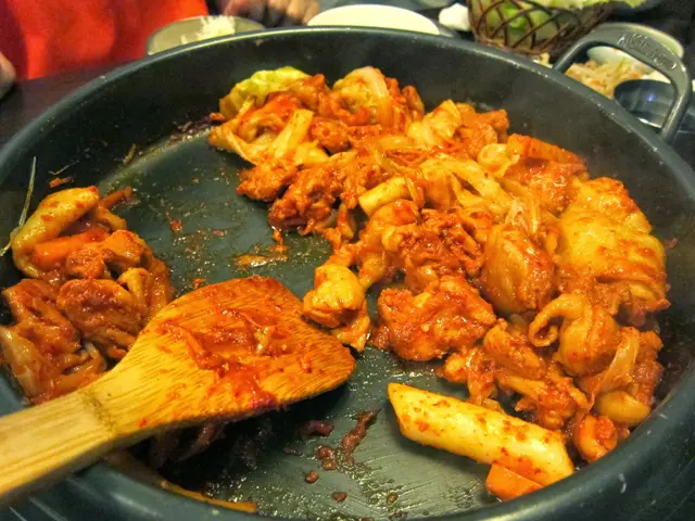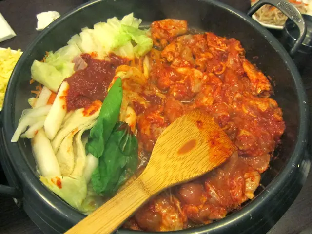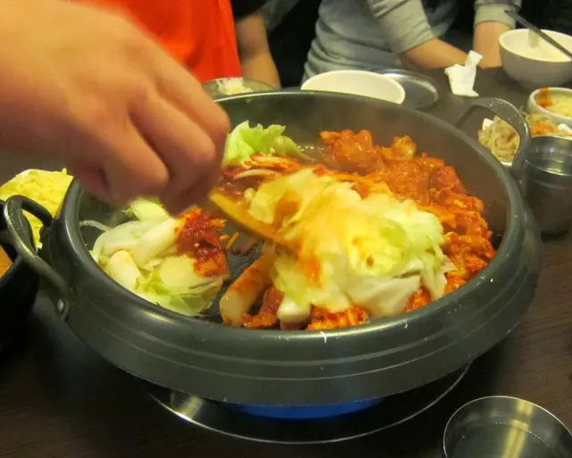 完成!原本還是紅綠分明的食材,現在全部被辣醬攻佔了~服務人員會把炒好的辣雞分成兩半,大的一半讓我們直接吃,小的一半留著待會幫我們拌飯炒,辣雞的辣度是小辣,雞肉肉質還算嫩,配上辣醬很過癮,其他食材還有豆皮、年糕等,我很愛辣辣的豆皮~年糕很Q,也還不錯!