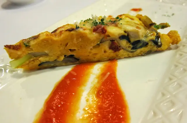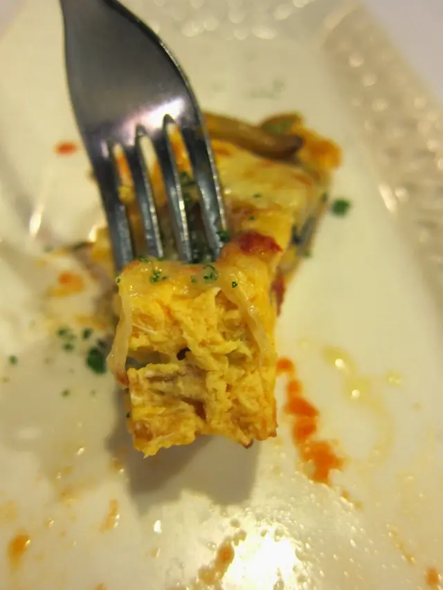 烘蛋上鋪上滿滿的起司,蛋裡加入馬鈴薯、黑橄欖、蔬菜等