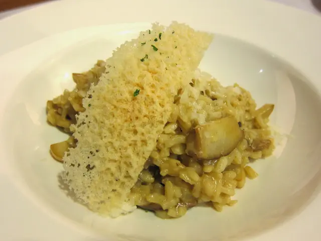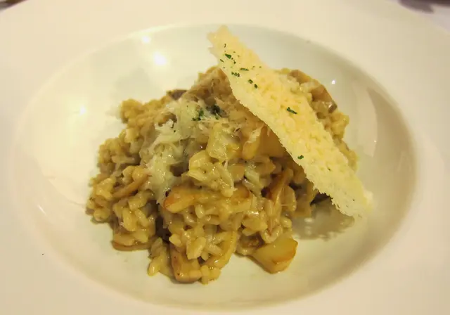 配料是份量不少的野菇,挖一口燉飯、配一顆菇、再挖一點Padano起司