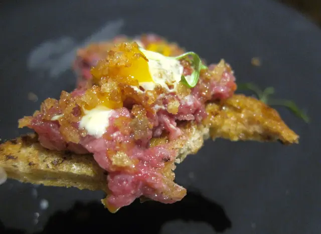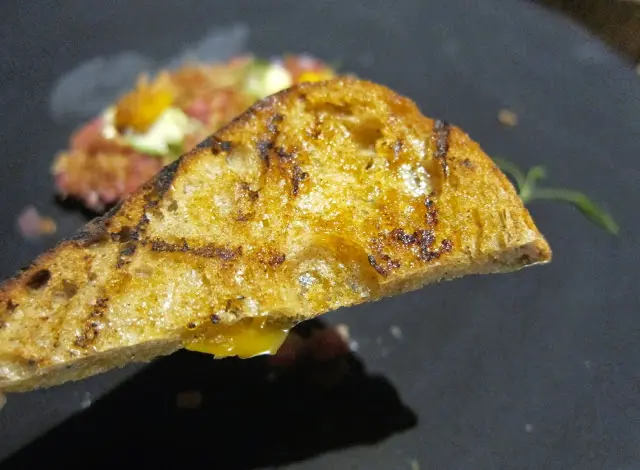 挖一坨tartare放在麵包上,有生牛肉的軟嫩、麵包的酥脆
