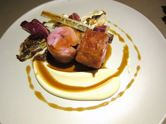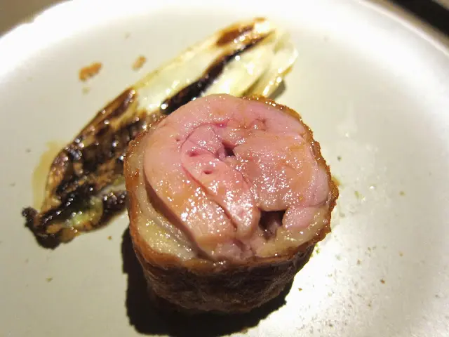 以雞肉捲的方式呈現,清脆的雞皮圍繞成一圈,把略帶粉色的雞肉圈在裡面