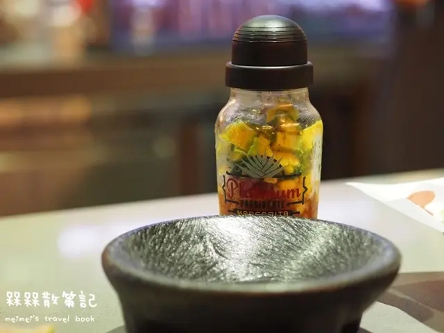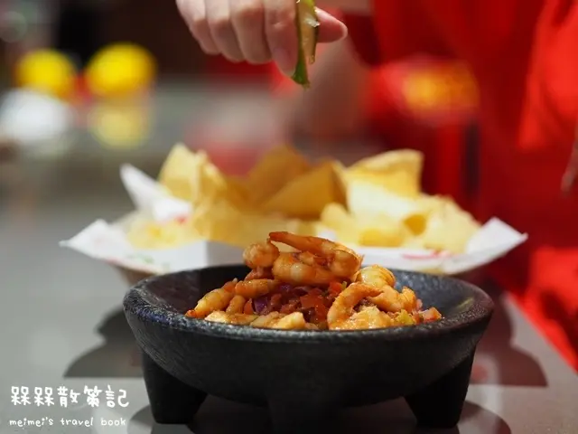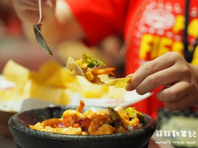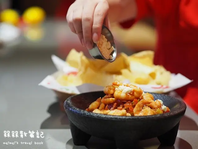 身穿墨西哥服的店員拿起手搖罐開始搖晃此道開胃菜,當所有鮮蝦、番茄丁、玉米粒、香菜與紅洋蔥透過搖搖杯而得以融合浸透於酪梨莎莎醬汁後,