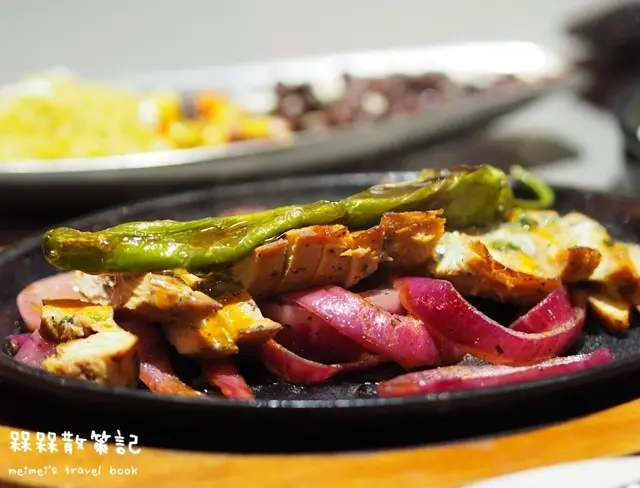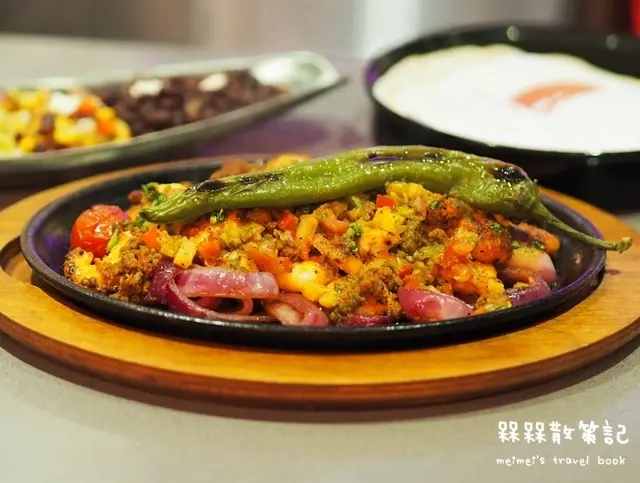 接下來上了多道法士達,每道法士達都放於鐵板之上,底層鋪上焦糖紅洋蔥與香蒜番茄的搭配,據說是正統墨西哥的風味。