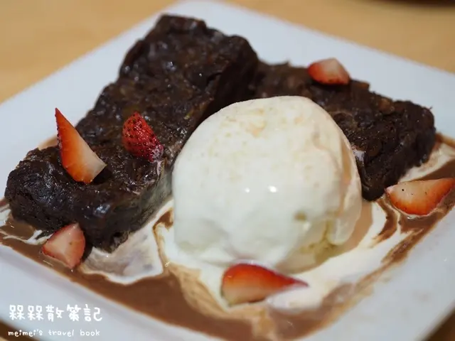 搭配香草冰淇淋與新鮮草莓,因為麵包布丁帶有的熱度使得香草冰淇淋不斷地流洩而下,冰熱交織的口味相當特別,