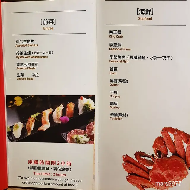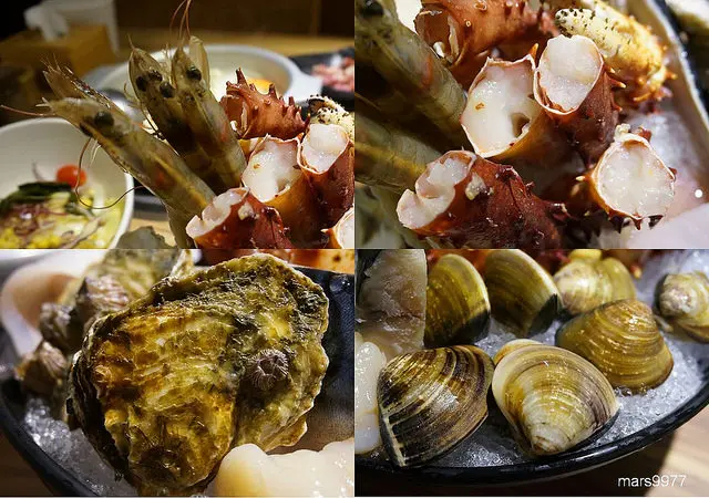 由帝王蟹、扇貝、干貝、鮮蝦、挪威鯖魚、透抽、蛤蠣、鮮蚵等