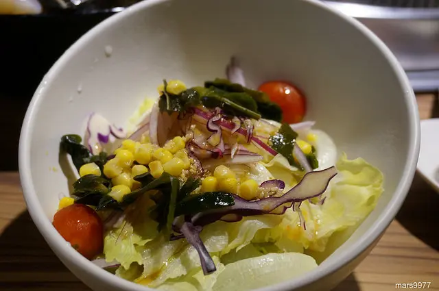 先來上一份,滿滿的生菜沙拉,有著美生菜、玉米、蕃茄、洋蔥等