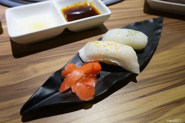 搭配上紅薑,讓旗魚以及刀工細緻透抽壽司
