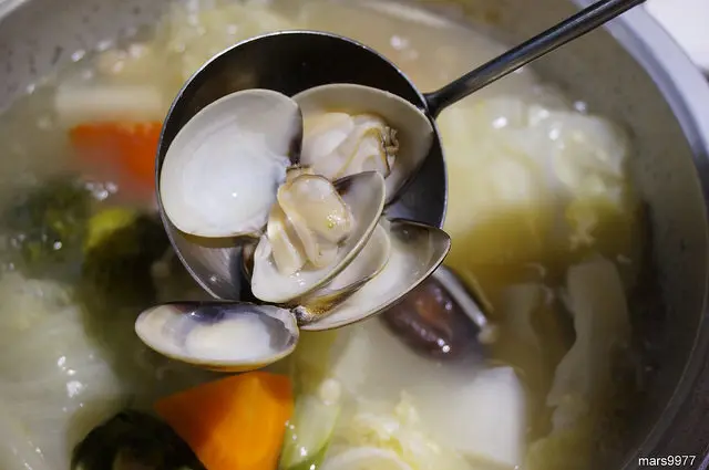 蛤蠣則是把他通通都丟到火鍋裡來煮,一個個打開後白嫩的肉就露出來了
