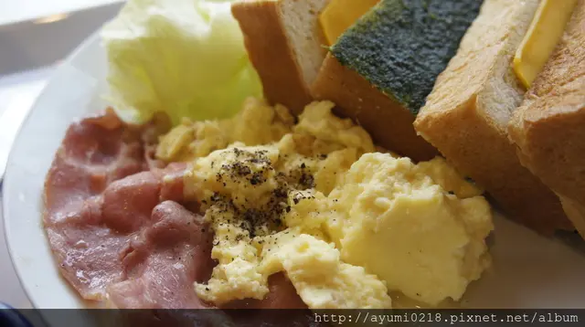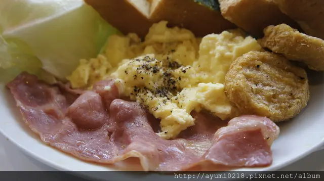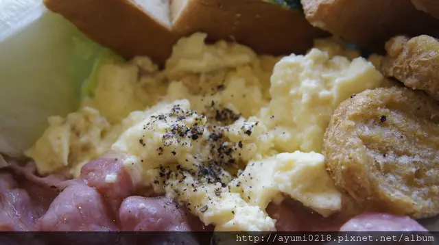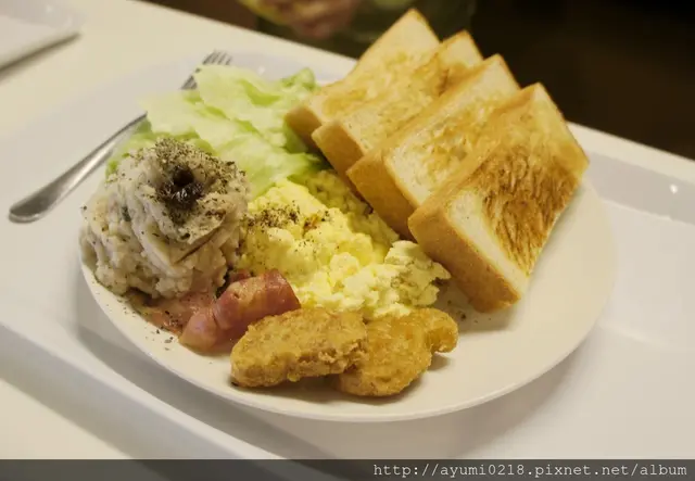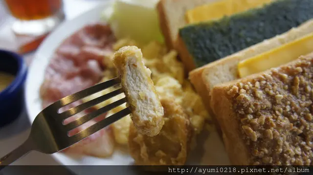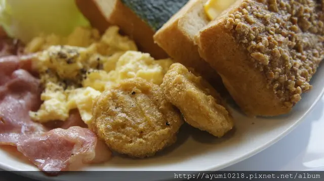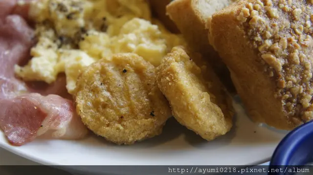 雞塊兩塊.炒蛋部會太水.至少有蛋香跟口感.大約兩顆.培根很大片.重點是不會煎得太乾