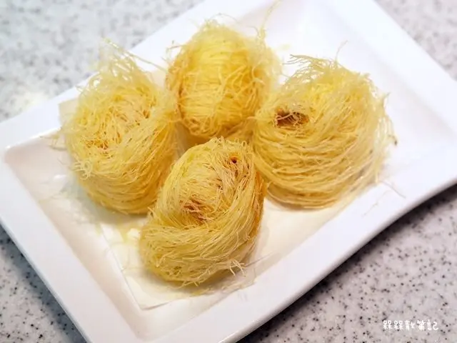 外面以炸米粉包裹,細絲繚繞的造型頗具特色,就像是鳥巢一般。