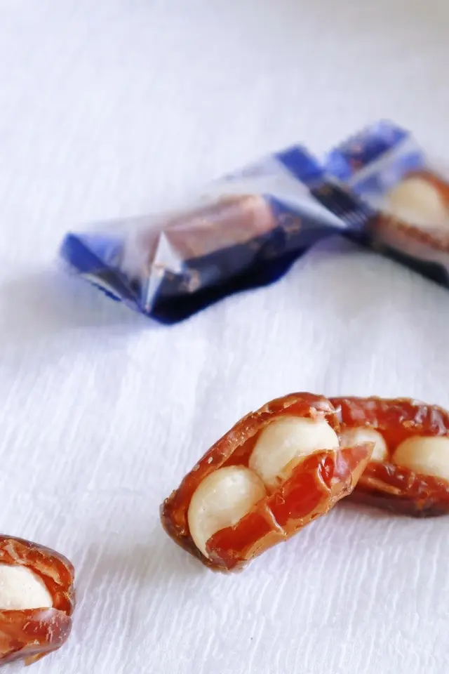 選用中東進口的椰棗,果肉細緻柔軟甜度選的很剛好,包著兩顆脆口飽滿的夏威夷果,很簡單卻也很耐吃。