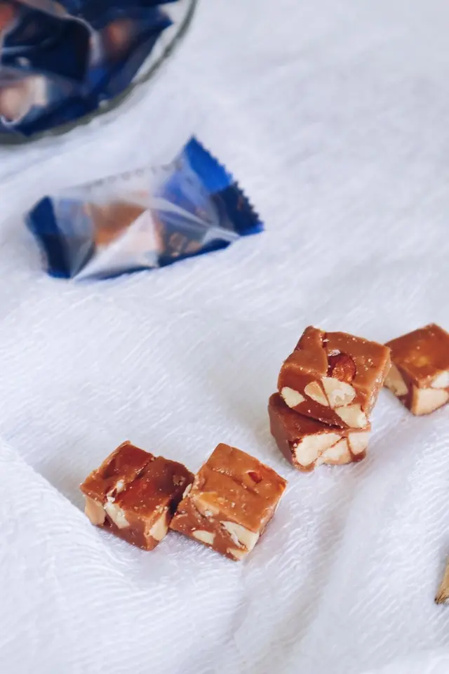 ▲每一小顆的太妃糖都裏著滿滿杏仁,質地偏硬脆不黏牙,