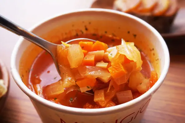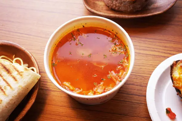 這蔬菜湯喝起來很爽口,滋味帶有蔬菜的香甜與番茄的果酸味