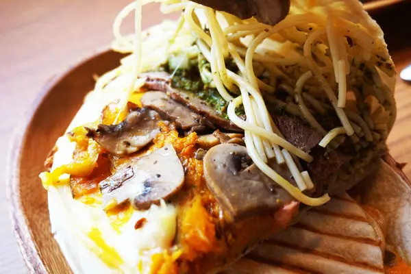 這次的烤餅,主食部分我選擇了香料牛排,配料部分則選了羅勒青醬、烤蘑菇與南瓜