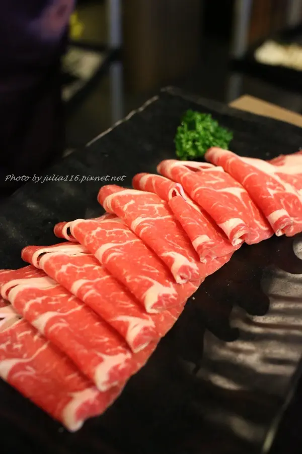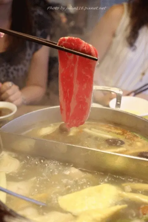 安格斯黑牛瘦肉比例高,油脂較牛小排少許多,涮至肉片呈現粉色即可撈起以免過老