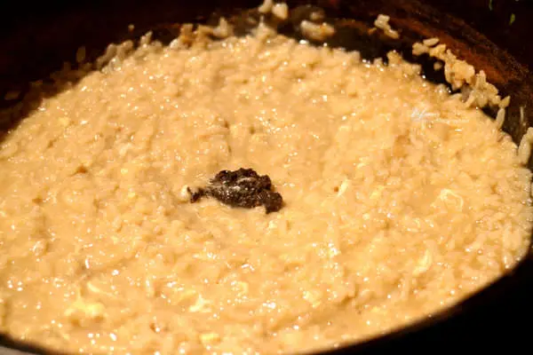 當飯粒吸飽了湯汁菁華,濃稠度還能依個人喜好調整,之後就會放下松露醬下去拌煮。