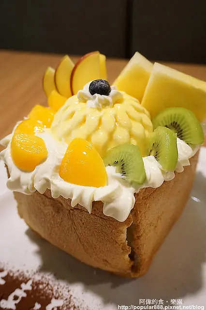 幾乎每桌必點的蜜糖吐司,從造型就讓人垂涎,中心的芒果冰淇淋還塑成花朵般造型。再搭配蘋果、鳳梨、芒果及奇異果四種新鮮水果,好繽紛啊!