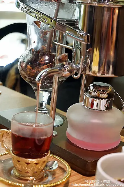 利用虹吸式的原理煮茶,熱水從右邊到左邊,將花果茶沖泡後又回到右邊。
