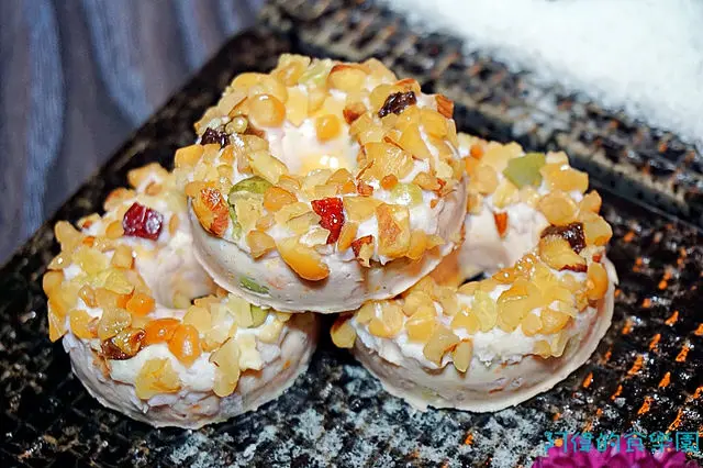 花枝漿為基底,還有南瓜、紅蘿蔔、青豆仁,搭配內餡有起司、堅果、杏果、核桃翠豆等,有非常豐富的膳食纖維,也很有創意。
