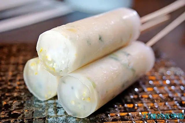 超像從冰庫拿出來的冰棒,這麼熱的天氣很適合來一根。但其實它是用鮮蝦、花枝及松阪豬肉,再加一些金桔丁提香。再用手工麵皮包裹,作工繁複卻細緻。