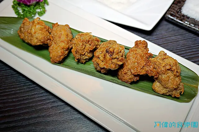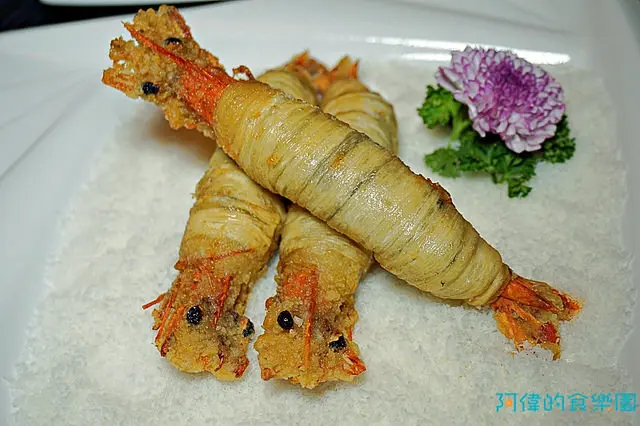 這也是很厲害的一款料理,看起來是炸帝王蝦,但裡面還有起司、雞軟骨、海苔等食材,最外層再用手工麵線纏繞而成。