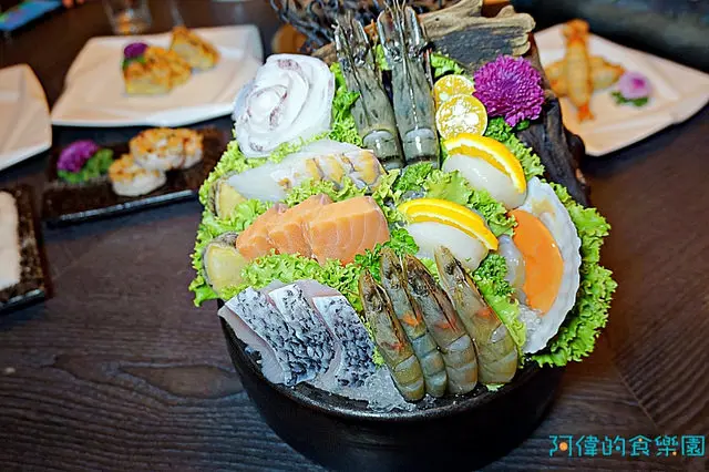 一整盆的海鮮有九孔鮑、帝王蝦、白蝦、扇貝、干貝,還有鱸魚、鮭魚及青衣魚三種魚