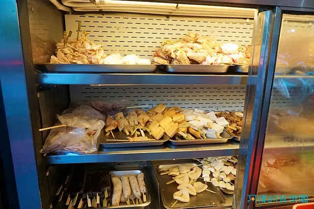 門口的冷藏櫃裡放著許多新鮮串燒,檯面上有盆子及夾子讓客人使用。