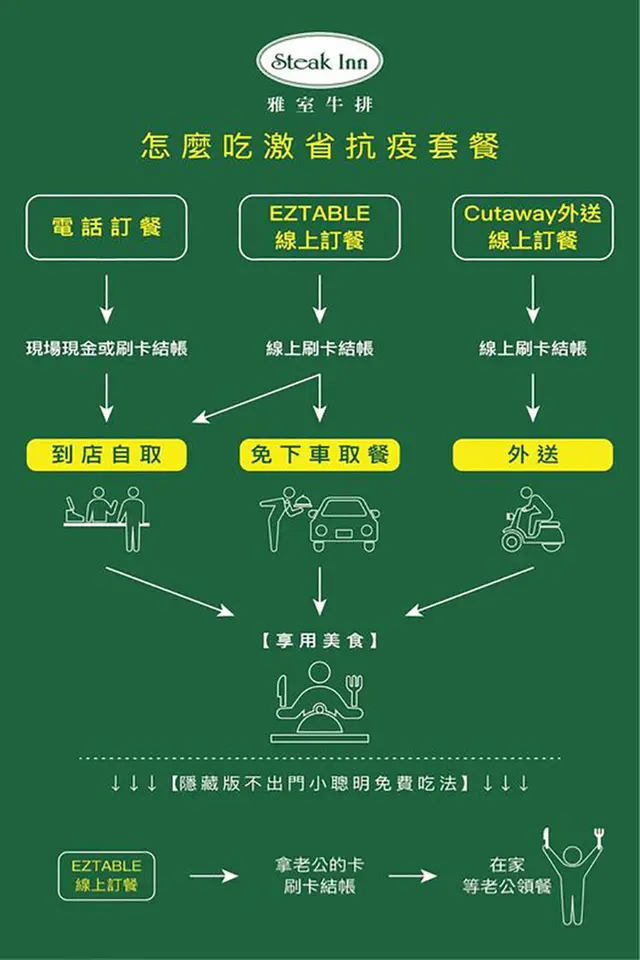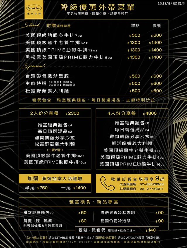 8/1開始供應,打電話訂餐自取,菜單價格再打9折呦!只要$450,就有牛排吃!與內用時期相比,最高大約是7折優惠喔!同時,近期推出新品餐點"輕鬆微套餐",解憂.輕.鬆餅,品嚐牛排後,來份鬆餅套餐作為ending,美好又愜意