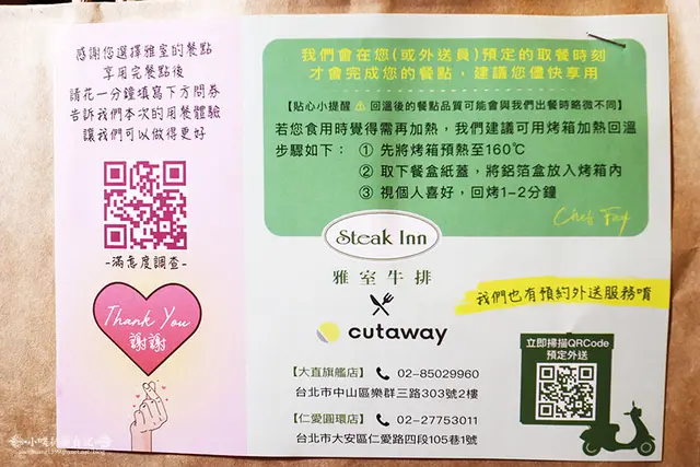 整體來說,"雅室牛排"的外帶、外送套餐,表現相當優異,這樣美味又高CP值的餐點,不但方便,食材又新鮮度極佳,不會因為外帶或外送,而破壞餐點的高品質