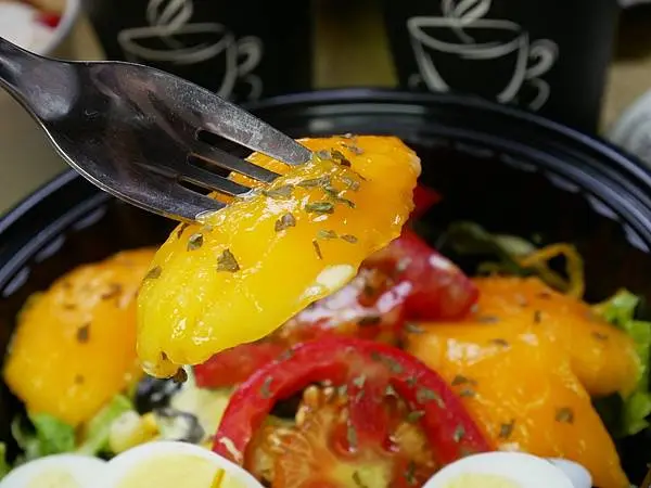 先來看一下沙拉,這沙拉是二人份,裡頭還融入了現在盛產的芒果,吃起來好香甜,跟清爽的生菜沙拉吃起來很對味!