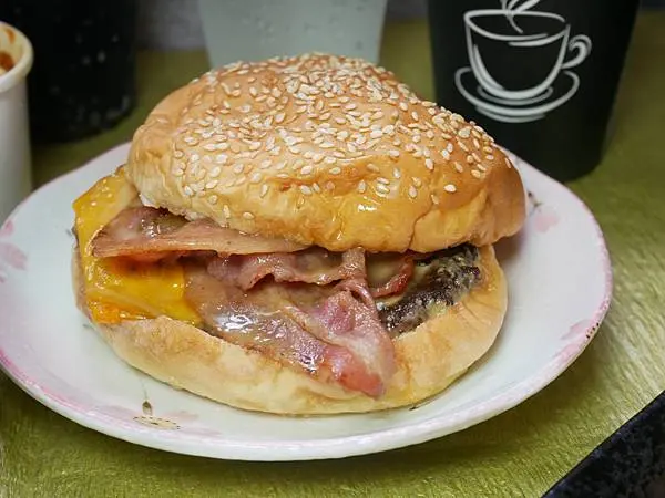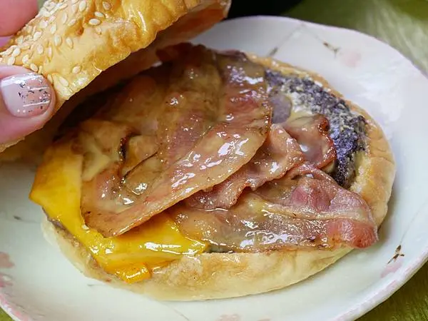 他裡頭除了有厚厚的漢堡肉外,還有濃郁的花生醬,重點是吃起來不會膩口,這花生醬跟培根、牛肉合在一起超對味,
