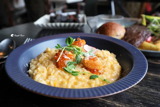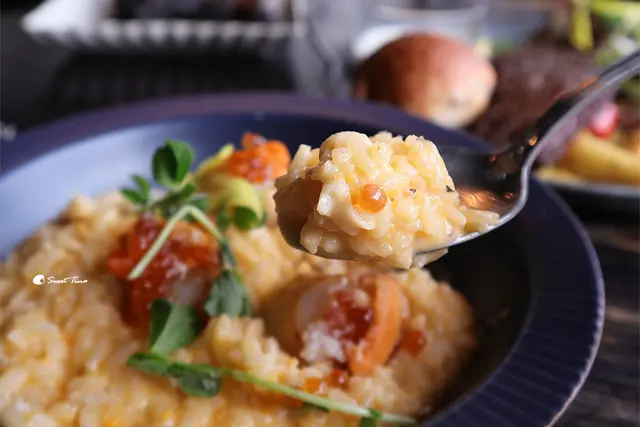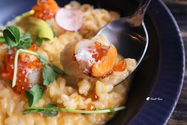 干貝海膽燉飯 - 這份為限量的菜色 (訂位限定菜),義大利米搭配上海膽、干貝、魚卵,每口都能感受到海鮮的美味,是份頂級的享受。