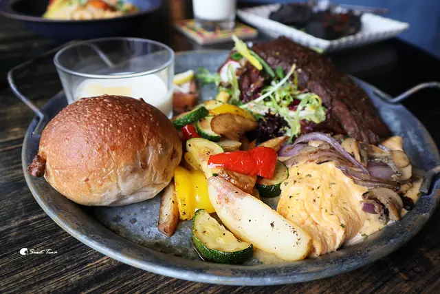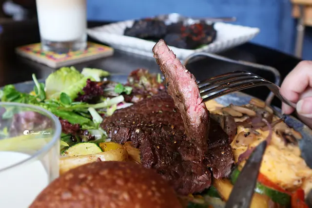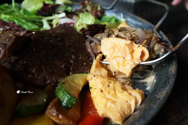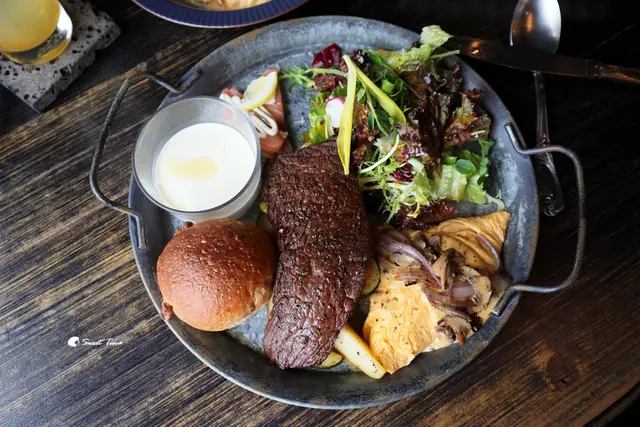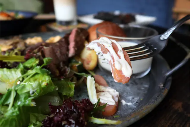 牛排就夠滿足了,想不到還搭配二塊燻鮭魚,海陸通吃超過癮。