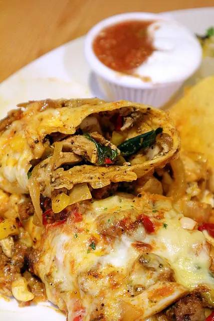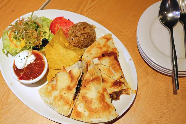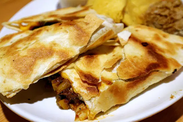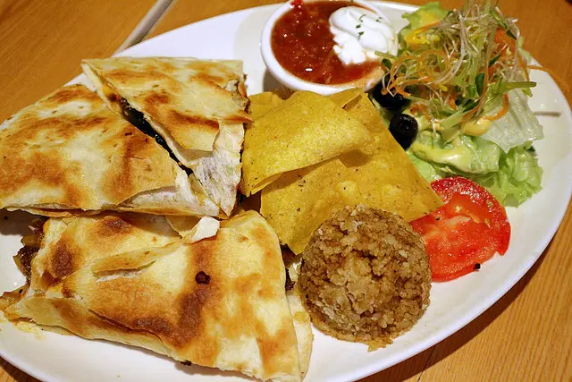 荷葉酥餅(Quesadilla)是兩片墨西哥餅夾著肉、蔬菜、辣椒、起司壓烤而成