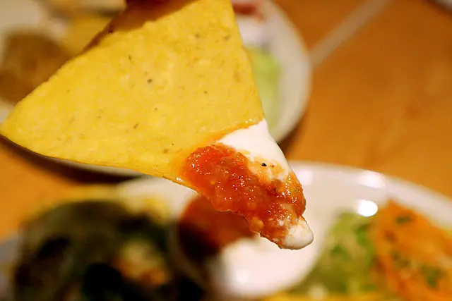 旁邊附上玉米脆片(Nachos),沾著酸奶與莎莎醬是最經典的吃法