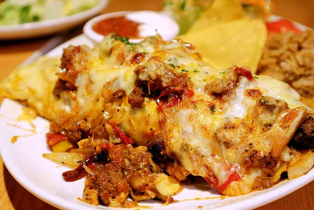 只是做法的差異:將食材用餅皮捲起,表面撒上大量起司烤過後流淌而下的邪惡料理