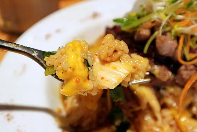 泡菜拌在燉飯當中,屬於比較溫和的辣度,但明顯是韓式風味