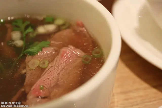 ▼首先放入四片肉片(建議),加入蔥蒜佐料,最後倒入滾燙高湯就形成營養好喝的牛肉湯啦