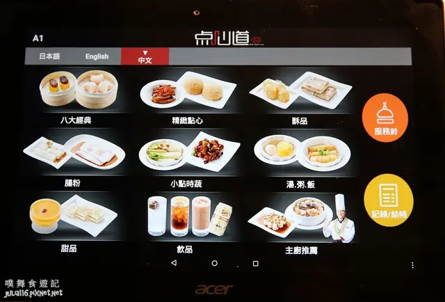 菜單語言分作日文/英文/中文三種,平板左上角"A1"代表桌號